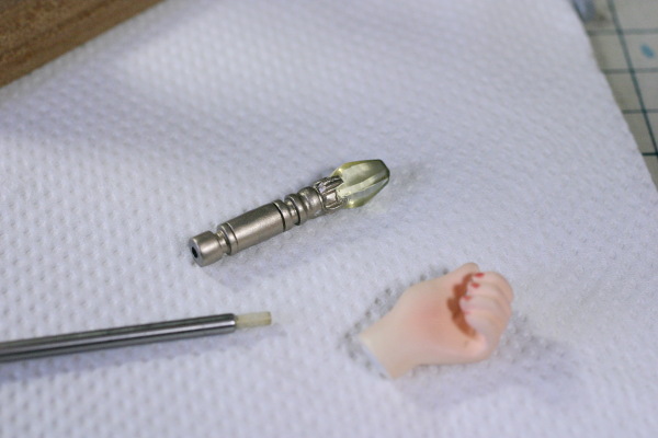 またオリジナルは杖の棒の部分と手が一体パーツでしたがステンレスパイプに置換する為削りました。