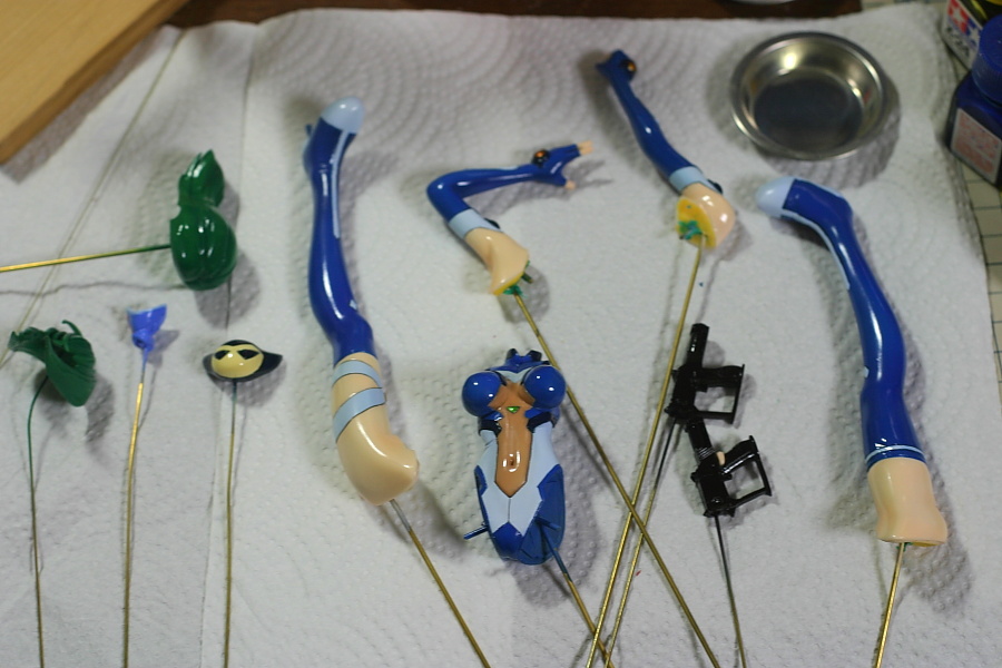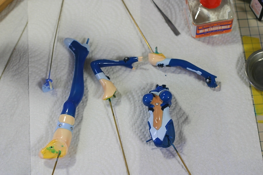 お腹の三角形の所、腕の丸っこい所と左大腿部についてるひし形の所はシルバーで塗装した後、エナメルのクリア系塗料で塗装。