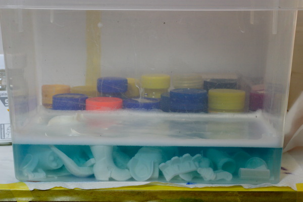 現在は一部の細かすぎるパーツを除き、バリとランナーの処理が終わり、クレンザーでの洗浄も終わり、入歯洗浄剤に漬け込み中です。