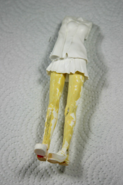 スカートに不要な部分があるため、画像の様に胴体パーツに真鍮線が刺さらない・・・そこでスカートの不要部分を削り込みました。