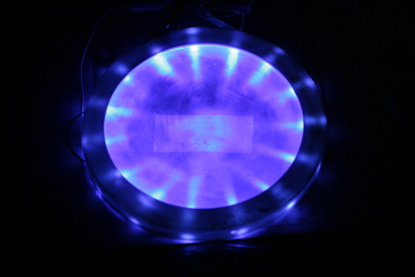 写真は紫っぽいですが実際には青い光です。