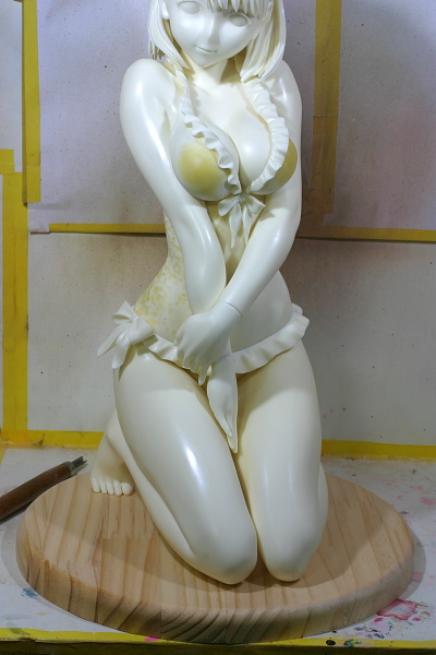 乳首を追加した加減で水着ブラのパーツにパテを盛って増量し、裏側を削って薄くしました。