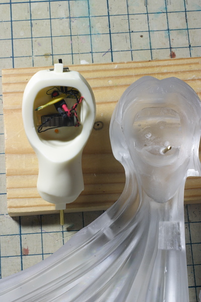 電池ボックスは顔パーツの内部に仕込み、髪の毛パーツの裏側に大穴空けて格納出来るようにしました。